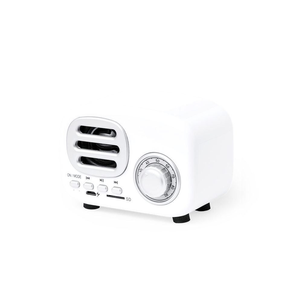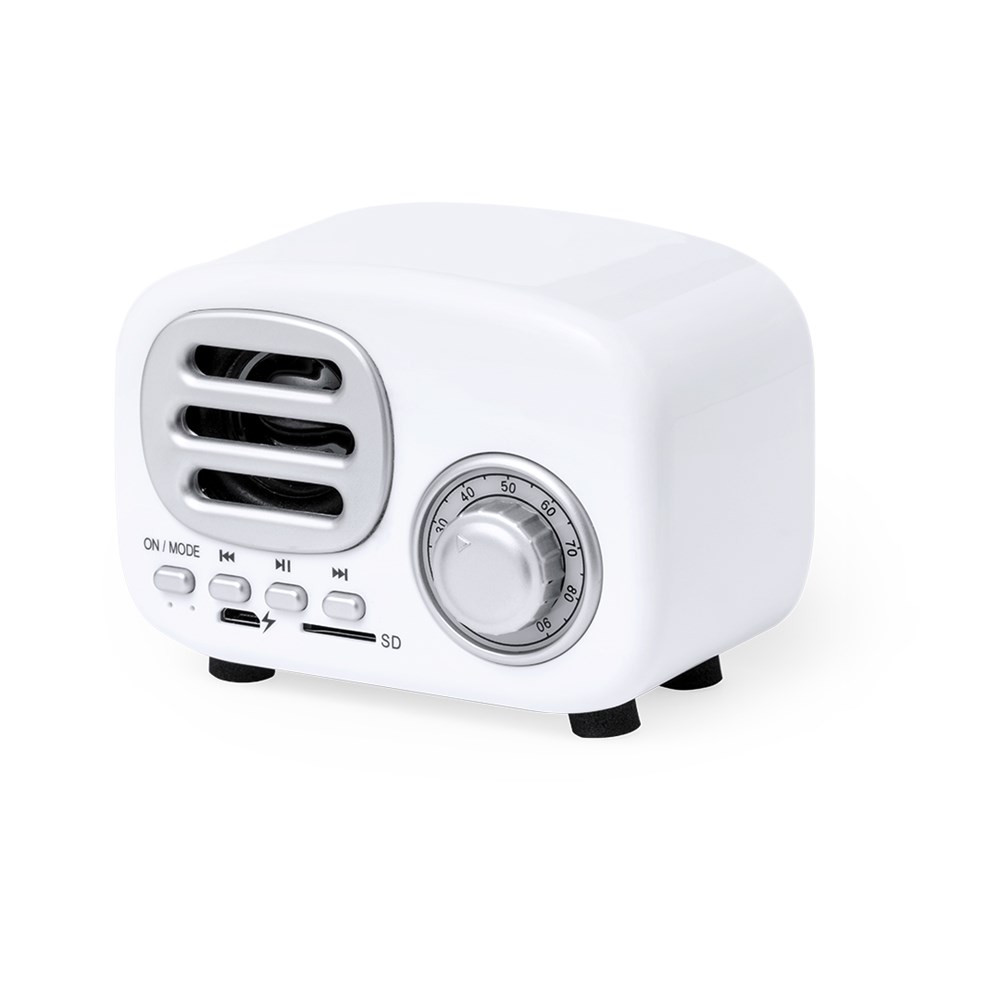 Compacte luidspreker in vintage stijl in de vorm van een vintage radio. met 3W vermogen. Met Bluetooth®-verbinding voor draadloze vrijheid, muziek afspelen en tegelijkertijd stijlvol zijn. Met indicatielampjes, slot voor Micro SD-kaarten tot 64 GB en 500 mAh batterij. Gepresenteerd in een aantrekkelijke kraft-designdoos, met handleiding in het Engels en Spaans.