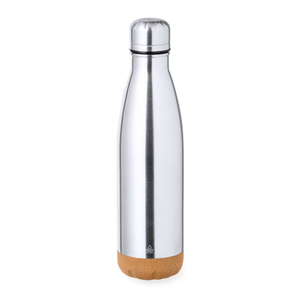 "Thermische fles van gerecycleerd roestvrij staal met dubbele laag en een inhoud van 500 ml. Zilverkleurige afwerking, met bijpassende schroefdop en basis van natuurkurk. BPA-vrij en met logo van gerecycleerd roestvrij staal. Gepresenteerd in een individuele kraft-designdoos.Staal is een van de meest gevraagde materialen en is bijna overal te vinden, van alledaagse producten tot grote constructies. Met talloze eigenschappen, waaronder duurzaamheid en een hoge mate van herbruikbaarheid, is het een zeer gewaardeerd alternatief voor duurzame oplossingen. Als ze op de juiste manier worden behandeld, kunnen er nieuwe hulpbronnen worden verkregen die oneindig bruikbaar zijn."