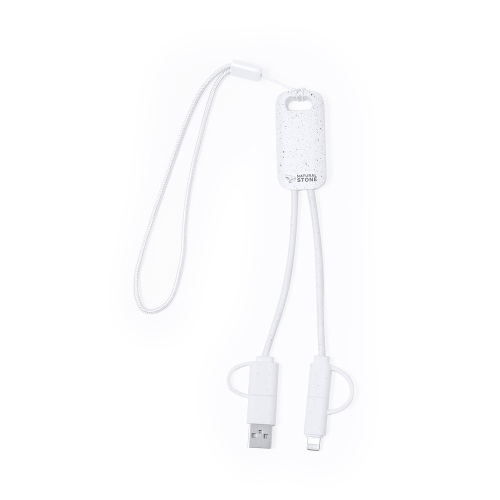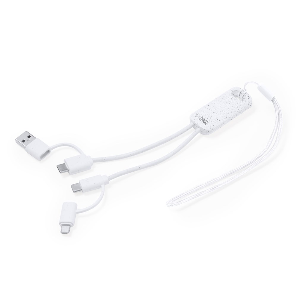 Oplaadkabel gemaakt van natuursteenextracten in combinatie met resistent ABS. Met Type C/USB-ingangen en Type C-, Lightning- en Micro USB-uitgangen. 5V DC 2,4A. Gepresenteerd in een individuele kraft-designdoos.Gemaakt van natuursteenextracten, waardoor het gebruik van kunststoffen wordt verminderd en een gladde en resistente afwerking wordt geboden."