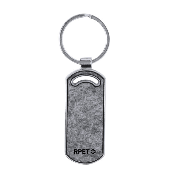 "Sleutelhanger gemaakt in een combinatie van metalen basis en RPET-vilt zijkanten. Verkrijgbaar in cirkelvormig ontwerp; in rechthoekig ontwerp met afgeronde hoeken; en in huis- en autovormen. Met groot merkoppervlak en RPET-logo aan de voorkant. Gepresenteerd in individueel gerecycled papier tas.RPET-vilt is het resultaat van de combinatie van de recyclingprocessen van plastic materialen en de eeuwenoude techniek van viltproductie, resulterend in een eco-trendmateriaal dat, naast dat het van gerecyclede oorsprong is, ook recyclebaar wordt. "