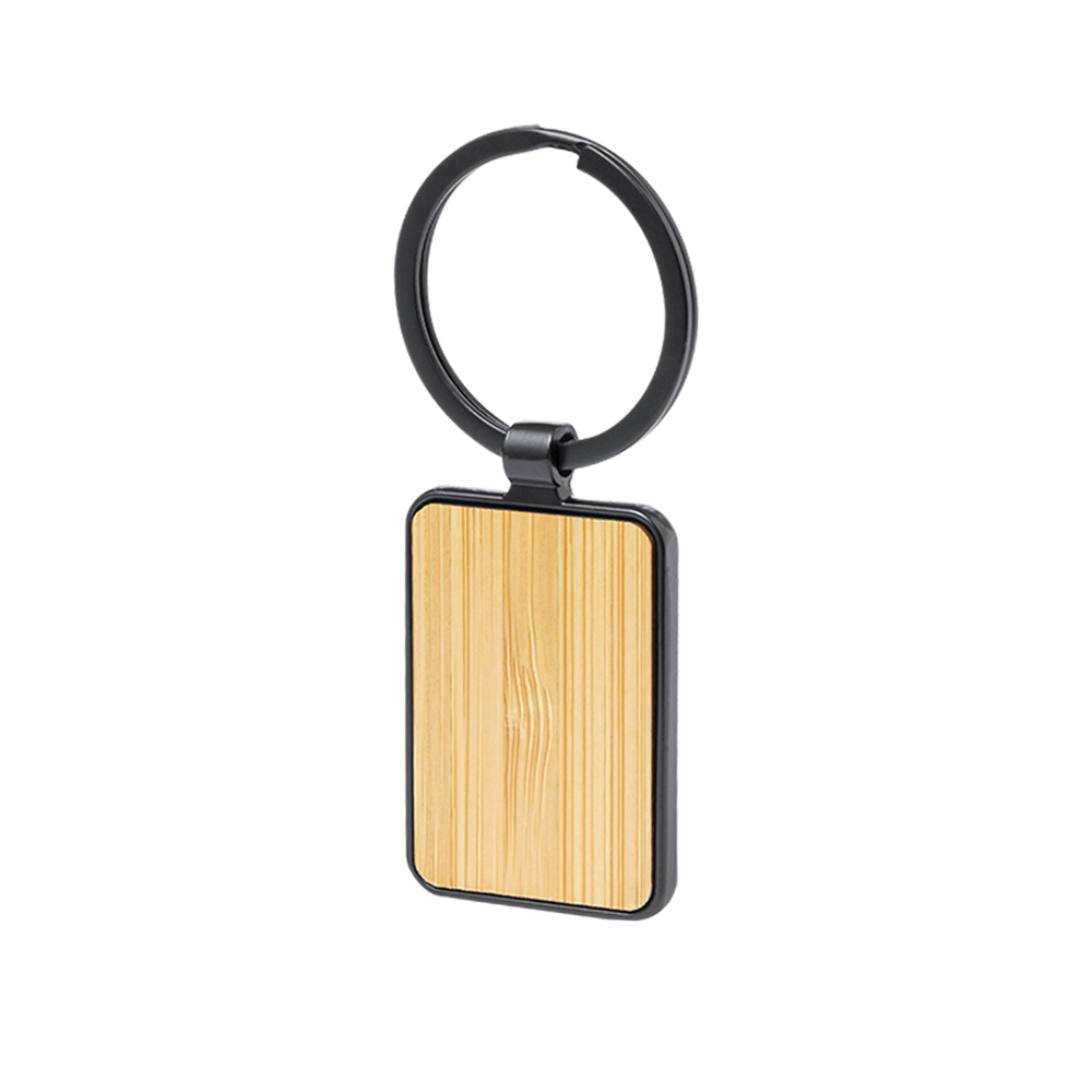 Elegant vormgegeven sleutelhanger, gemaakt van zwart gepolijst metaal, met een zachte bamboe...meer