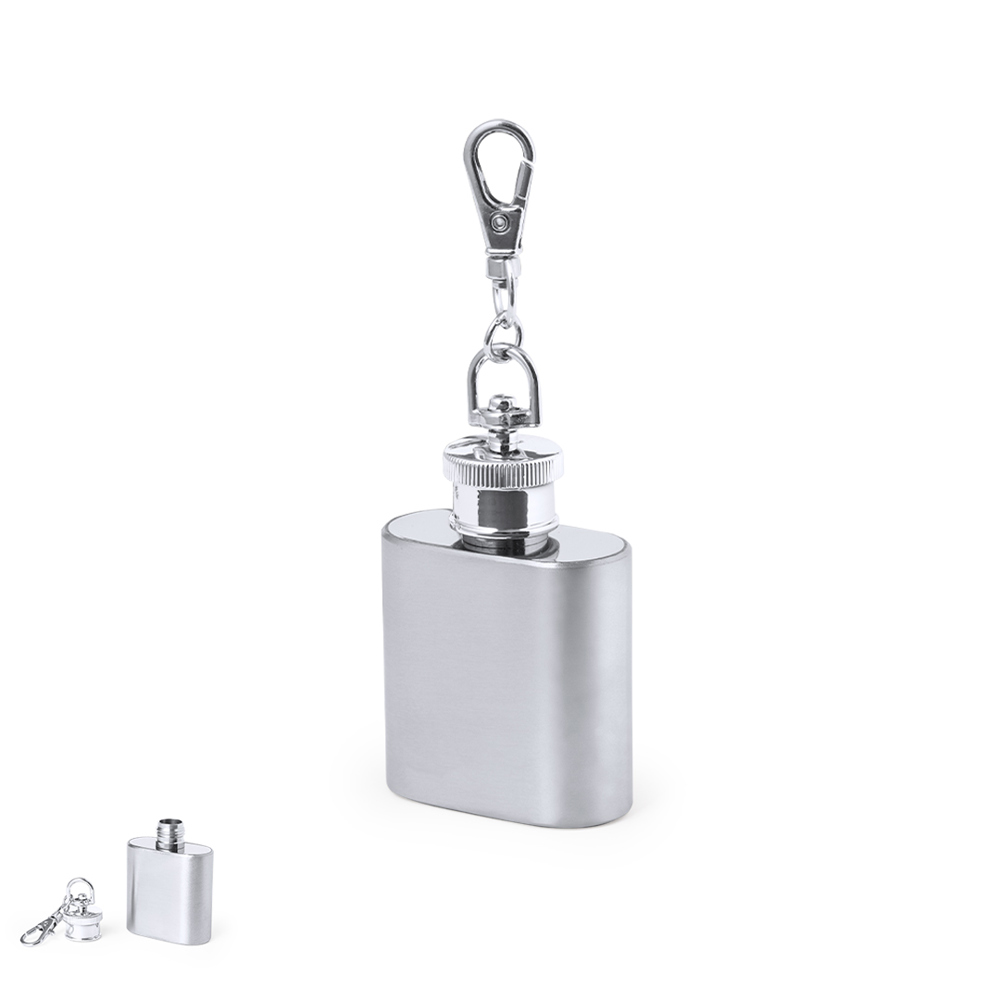 Handige sleutelhanger van roestvrij staal met een inhoud van 30 ml. Deksel met opschroefbaar veiligheidsdeksel en draaibare haak. Gepresenteerd in een individuele, kraftdesigndoos.
