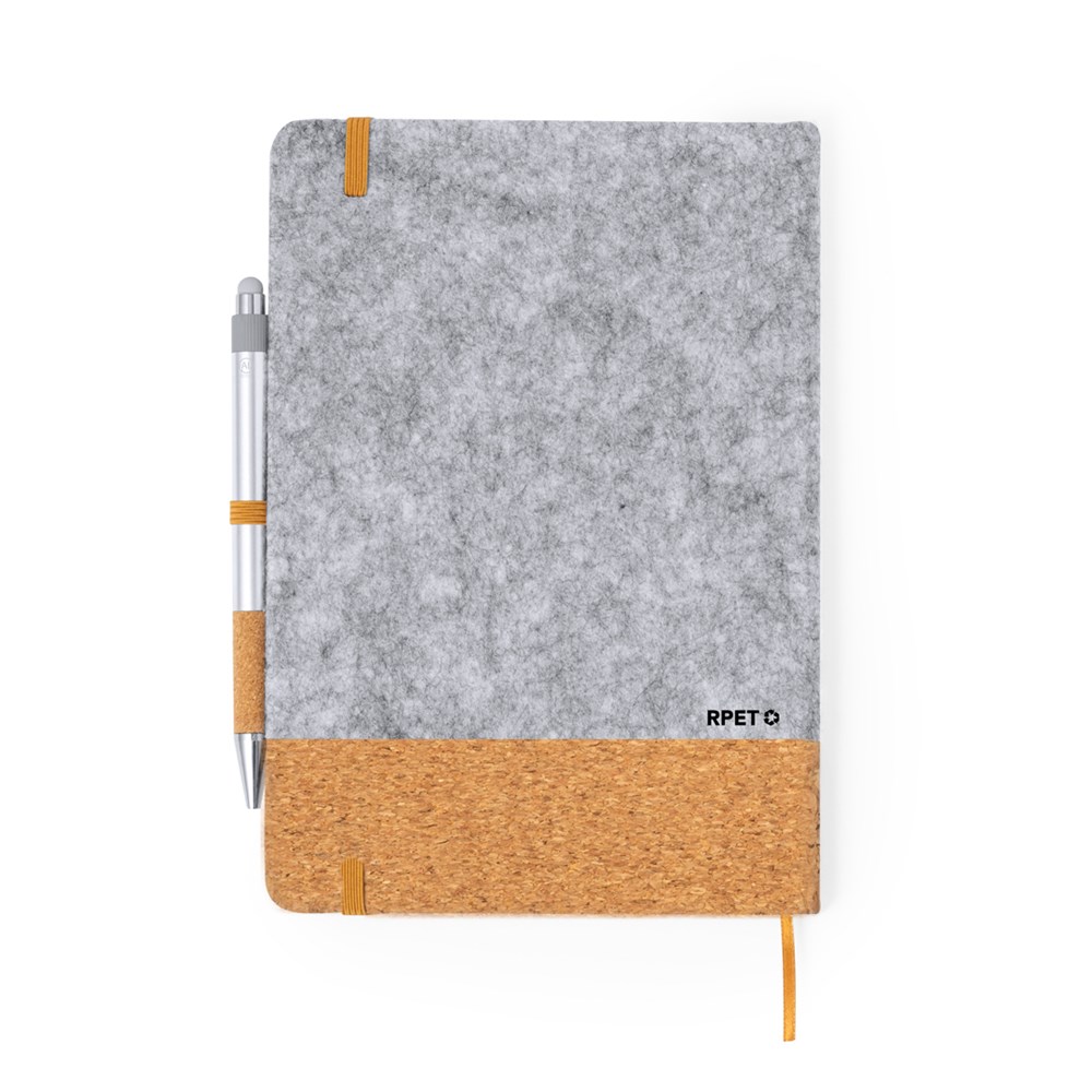 Notitieblok en balpennenset gemaakt van RPET-vilt en gerecycled aluminium. Inclusief een notitieblok met harde kaft, gemaakt van RPET-vilt en natuurkurk, met 80 gelinieerde pagina's, elastische bandsluiting, boekenlegger en een bruine balpenhouder. Daarnaast bevat het een balpen van gerecycled aluminium met grip van natuurkurk, drukknopmechanisme en blauwschrijven. Elegant gepresenteerd in een geschenkdoos.RPET-vilt is het resultaat van de combinatie van de recyclingprocessen van plastic materialen samen met de duizendjarige techniek van viltproductie, wat resulteert in een eco-trendmateriaal dat niet alleen van gerecyclede oorsprong is, maar ook recyclebaar wordt.