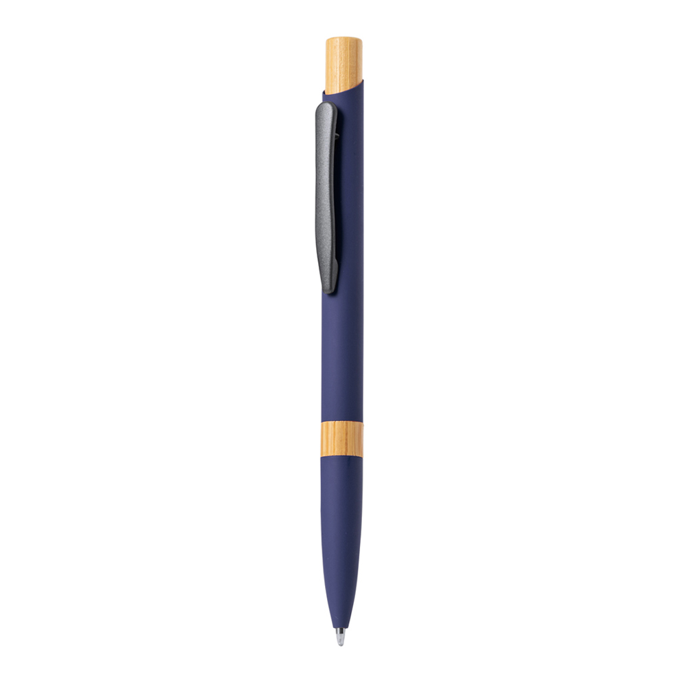 Stijlvolle aluminium balpen met drukknopmechanisme. Pen met matte rubberen afwerking en bamboe accenten, verkrijgbaar in een groot aantal opvallende kleuren. Metalen clip, jumbocartridge en blauwe inkt. Geleverd in een individueel gerecycled zakje. Materialen zoals bamboe bevorderen het gebruik van natuurlijke grondstoffen en verminderen zo de uitstoot van vervuilende stoffen. Het is afkomstig van een zeer resistente en veelzijdige plant, met snelle groei en regeneratie, waardoor het een uitstekend alternatief is voor het gebruik van traditioneel hout.