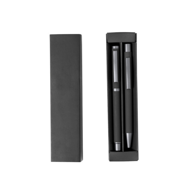 Stijlvolle balpen en rollerpen set. Balpen met drukknop en rollerbal met dop, beide met metalen clip, jumbo vulling en blauwe inkt. Etui in verschillende effen kleuren, met rubberen afwerking en donkergrijze metallic accenten. Gepresenteerd in een etui in bijpassende kleur, met een gestanst vak voor elk onderdeel.