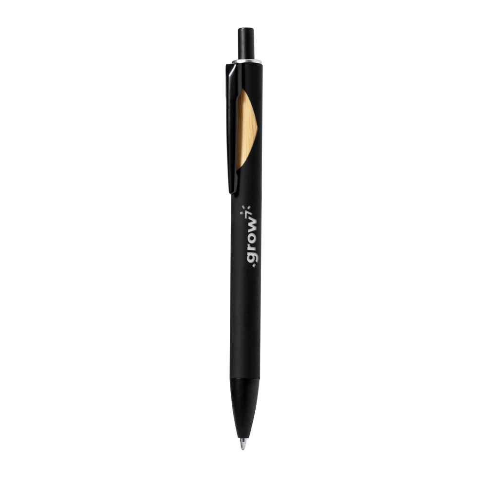 Balpenaanwijzer met drukknopmechanisme. Stevige zwarte houder en topmontage in verschillende kleuren. Speciaal ontworpen voor lasergravure, inclusief een speciale coating om uw logo goed te kunnen graveren in bijpassende kleur. In blauwe inkt en gepresenteerd in een individueel gerecycled zakje. Materialen zoals bamboe bevorderen het gebruik van natuurlijke grondstoffen en verminderen zo de uitstoot van vervuilende stoffen. Het is afkomstig van een zeer resistente en veelzijdige plant, met een snelle groei en regeneratie, waardoor het een uitstekend alternatief is voor het gebruik van traditioneel hout.