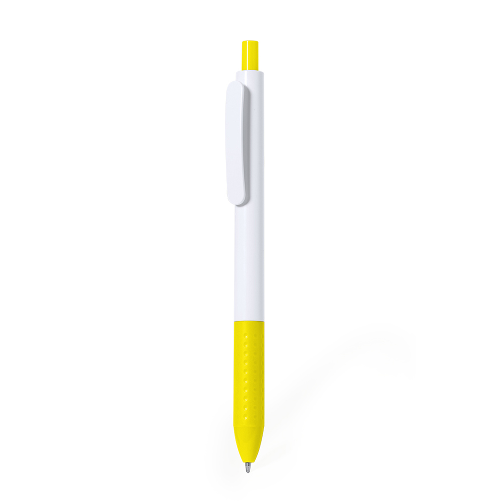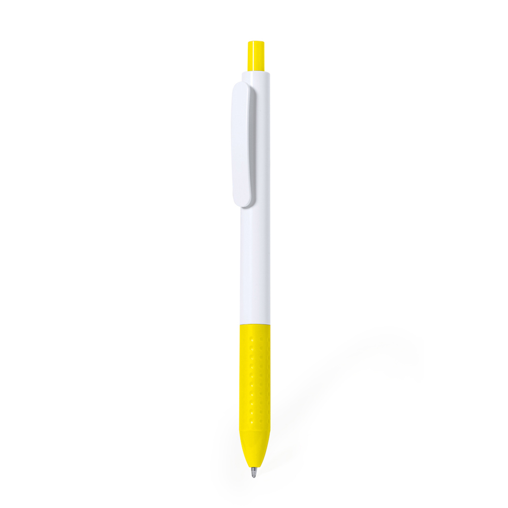 Balpen van ABS met drukknopmechanisme. Gemaakt in een elegante combinatie van houder en clip in witte tinten. Drukknop en grip verkrijgbaar in verschillende levendige kleuren. In blauwe inkt.