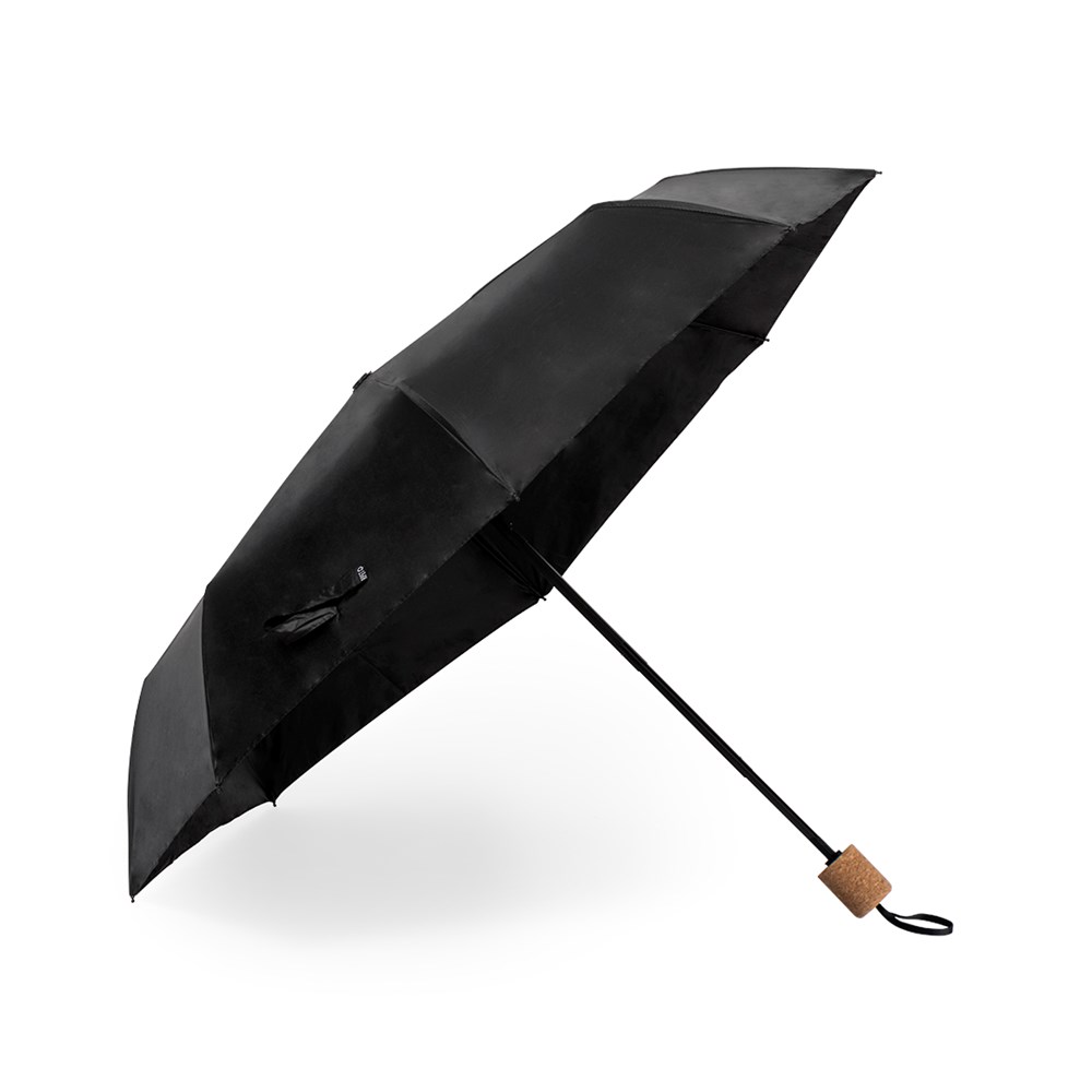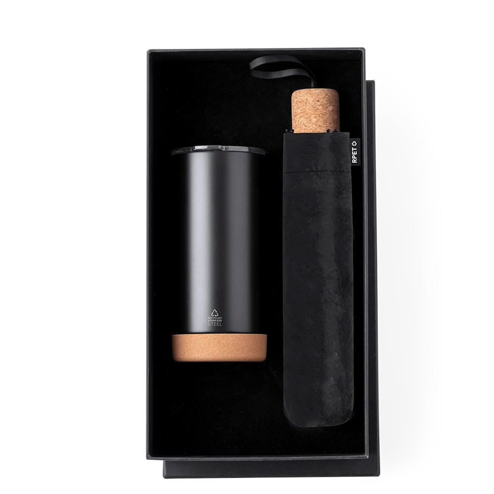 Stijlvolle premium set. Inclusief: Gerecycleerde roestvrijstalen thermosbeker met dubbele wand en een inhoud van 550 ml, in een elegante matzwarte afwerking. Kurkenbodem, met opsteekdeksel en dispenser. Het is ideaal voor op je bureau, tafel of elk ander oppervlak waar je rustig van je favoriete drankje kunt genieten. Opvouwbare zwarte paraplu met een diameter van 98 cm. In 190T RPET pongee materiaal en met kurken handvat. Handmatig te openen, met winddicht mechanisme en glasvezelribben. Met onderscheidend RPET-label. Set gepresenteerd in een individuele doos met matte afwerking, met binnenste stansen voor elk van de elementen van de set.Het RPET-materiaal is gemaakt van gerecycled plastic, bevordert het hergebruik van plastic afval en draagt ​​bij aan de duurzaamheid van de planeet."