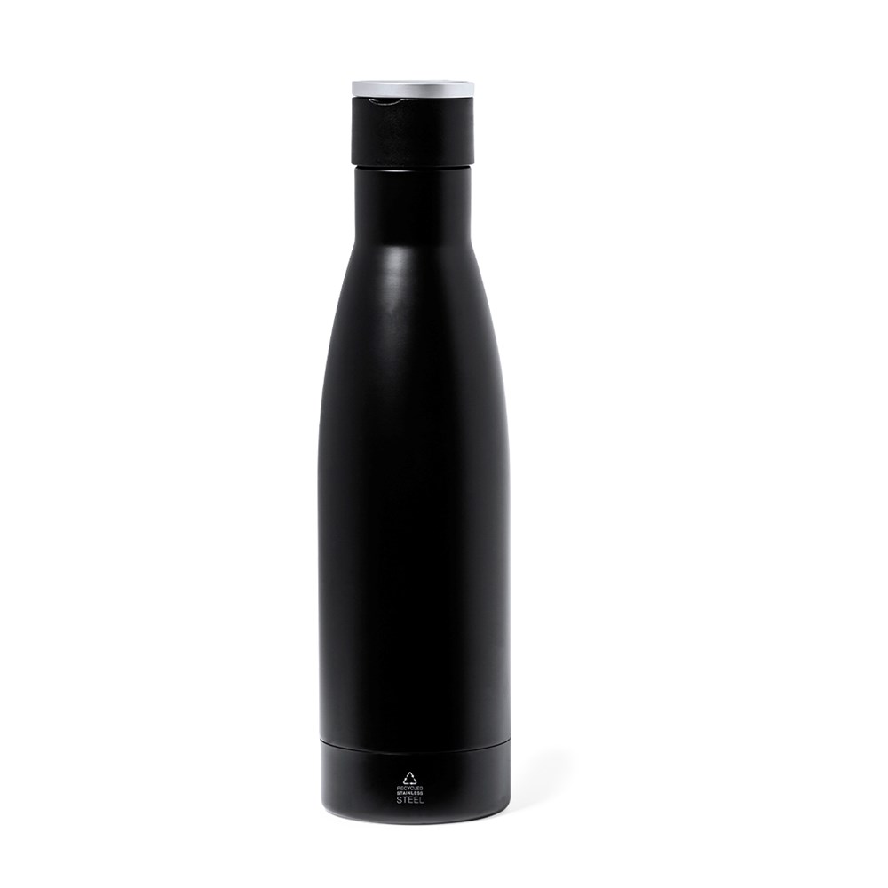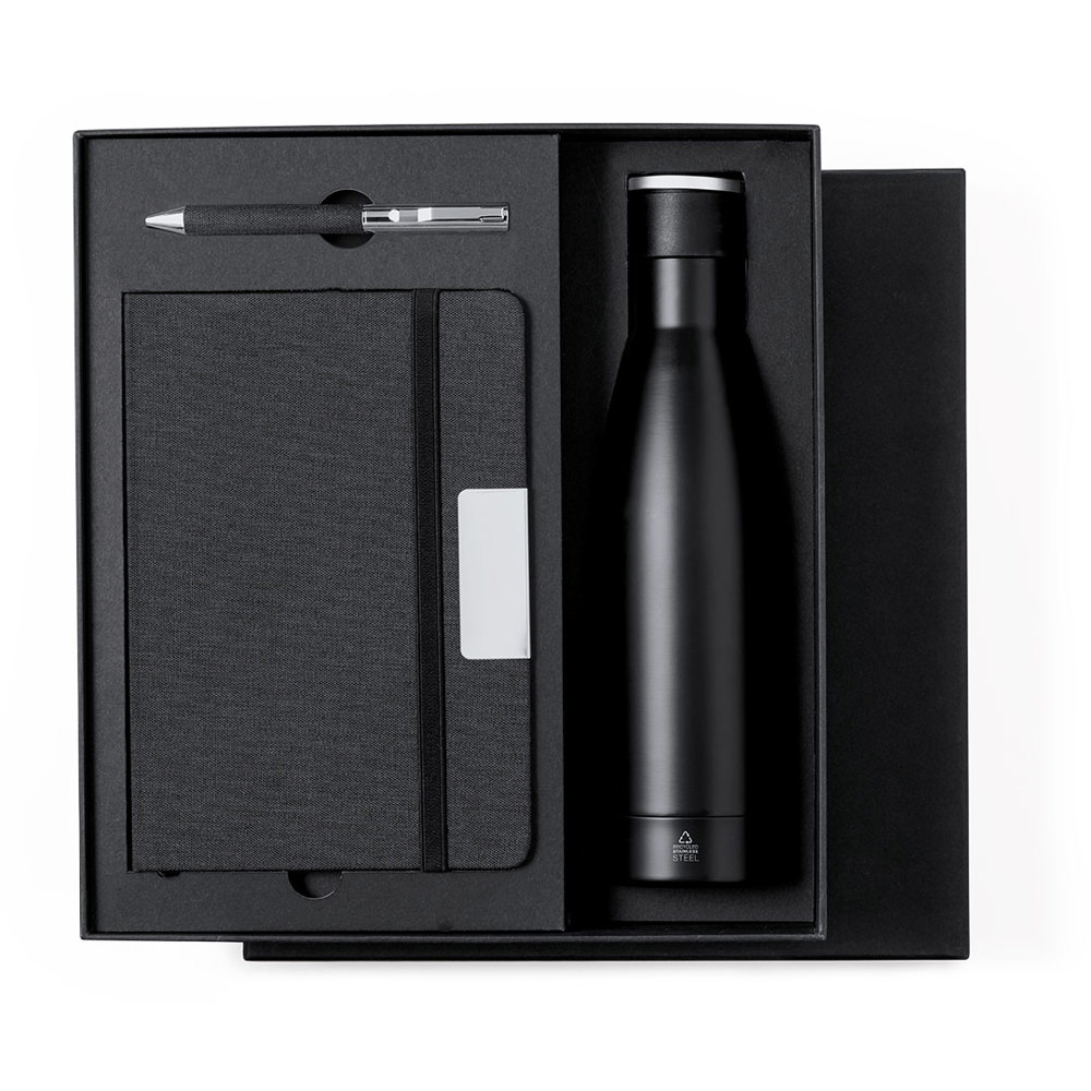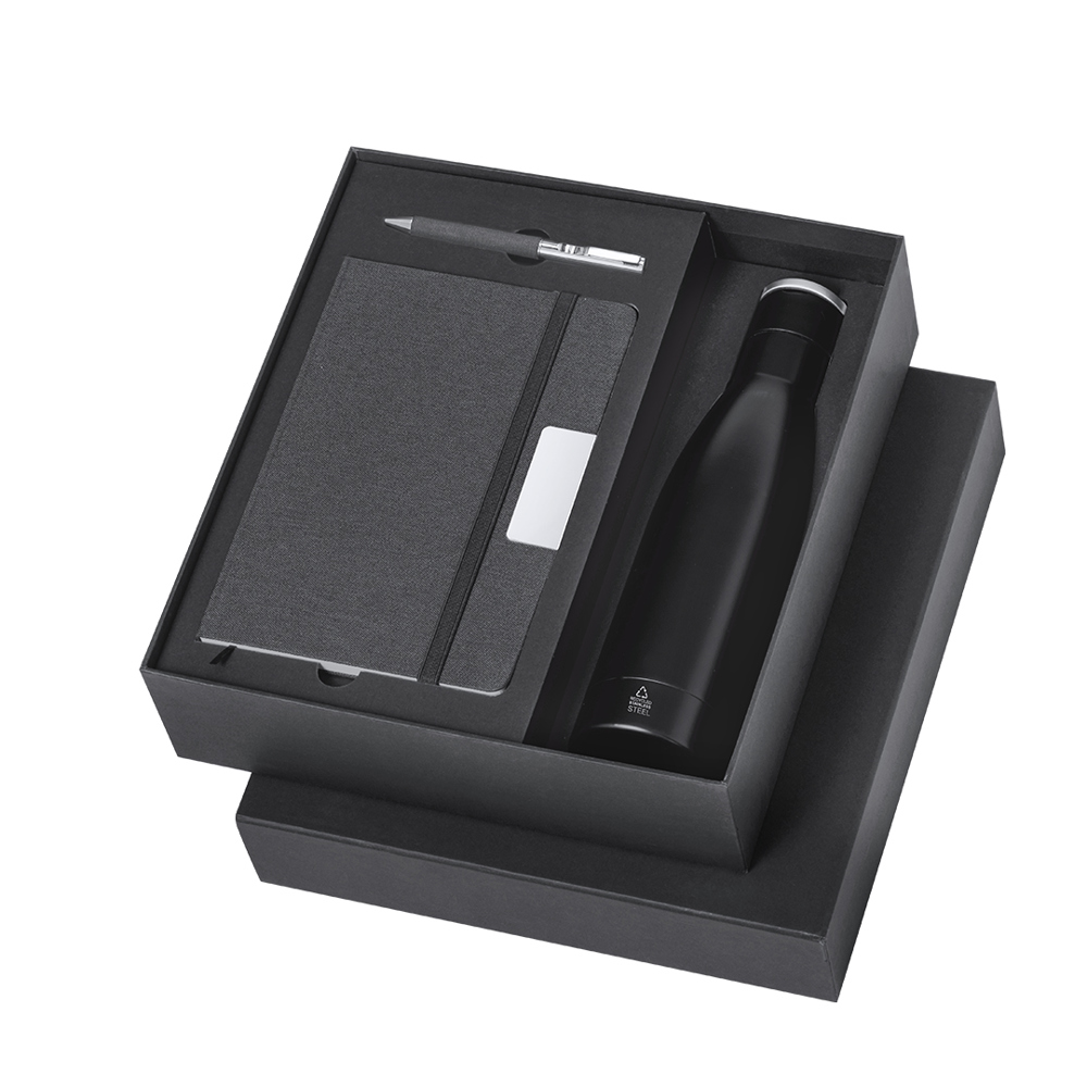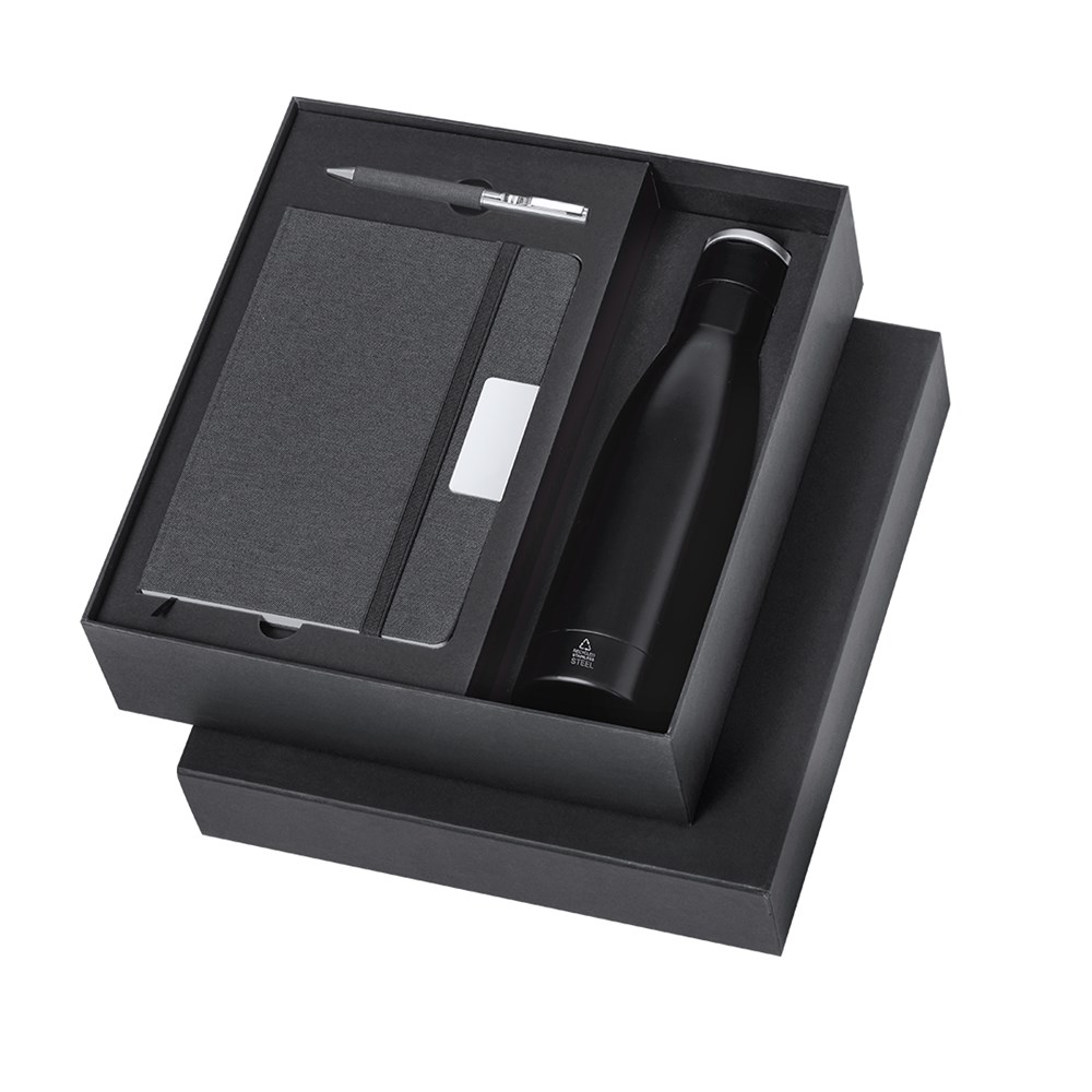 "Stijlvolle premium set. Inclusief Dubbellaagse kolf met een inhoud van 500 ml, gemaakt van gerecycled roestvrij staal met matzwarte afwerking en een stevig handvat van matzilveren metaal. Met roestvrijstalen logo.RPET notitieblok in een elegante zwarte kleur, met een speciaal metaal laat voor lasergraveren. Inclusief elastische sluiting en stoffen boekenlegger. Interieur met 80 vellen enkelgestreepte lay-out. Met RPET-logo.RPET balpen met matzwarte afwerking, draaimechanisme en blauwe inkt. Met clip en gepolijste metalen punt.Set gepresenteerd in een individuele doos met matte afwerking, met uitgesneden binnenkant voor elk van de elementen van de set.Het RPET-materiaal is gemaakt van gerecycled plastic, bevordert het hergebruik van plastic afval en draagt ​​bij aan de duurzaamheid van de planeet."