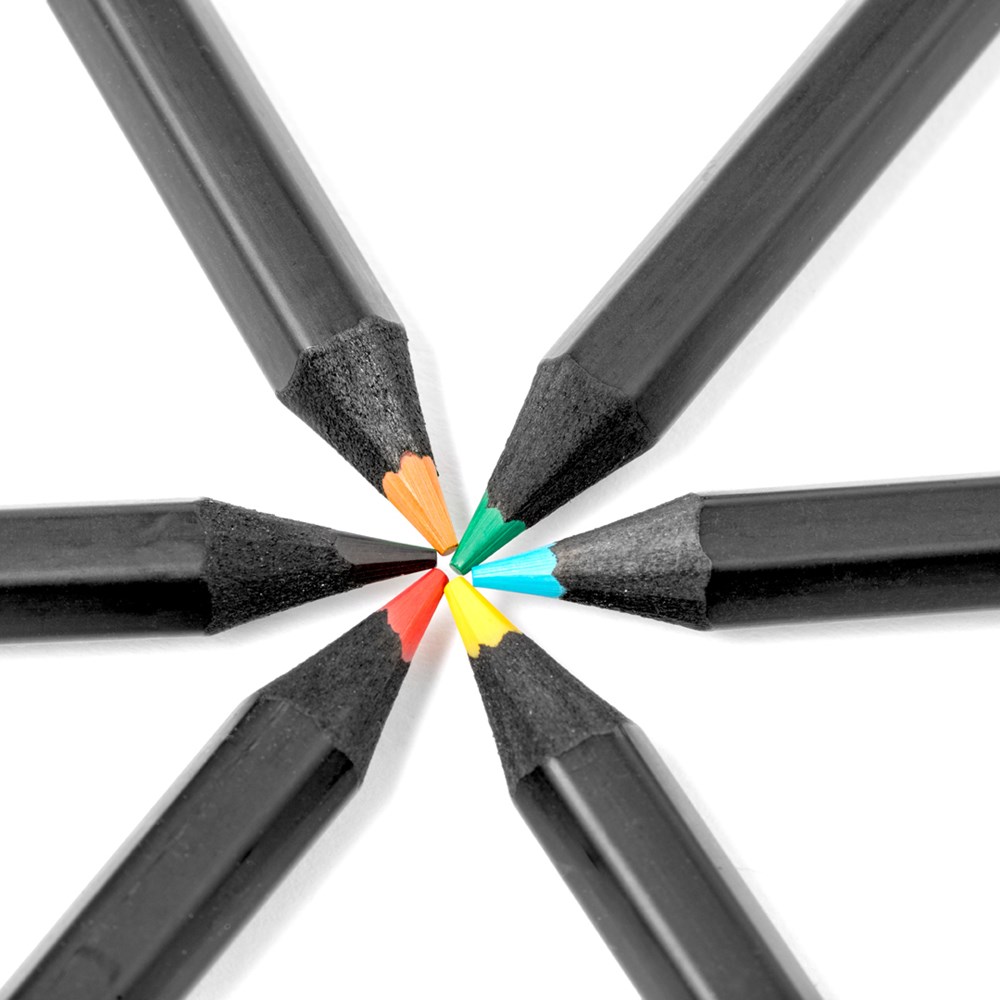Set van 6 houten potloden afgewerkt in zwart, met zeshoekig lichaam en stiften in verschillende kleuren. Gepresenteerd in een zwarte gerecyclede kartonnen doos met klepsluiting.