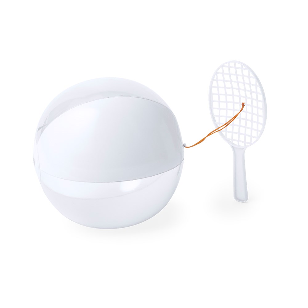 Leuke set van racket en bal in een combinatie van witte en doorschijnende kleuren, bevestigd door een elastische band. Met opblaasventiel en gepresenteerd in een gerecyclede zak.