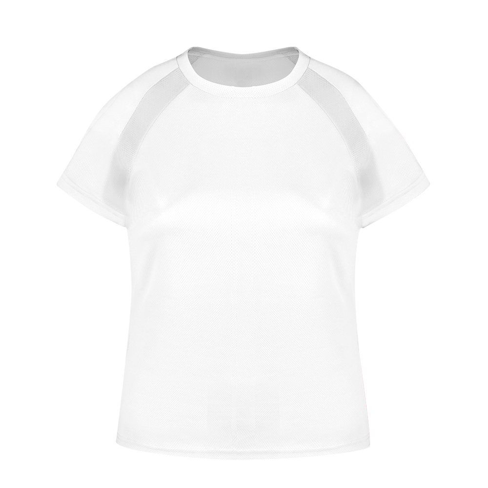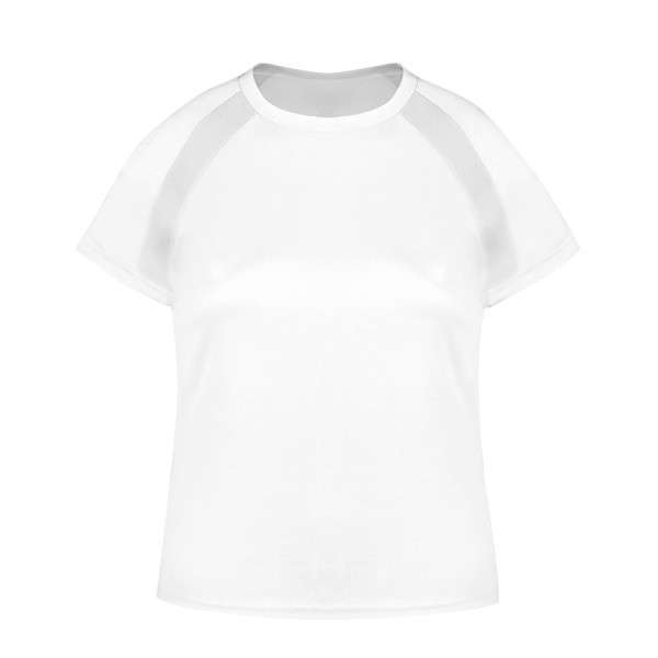 Technisch T-shirt voor dames van 100% polyester, ademend materiaal van 135 g/m2. Met raglanmouwen, ronde hals en met voor- en zijbanden van ademende micro-geperforeerde stof. Verkrijgbaar in de maten S, M, L, XL.