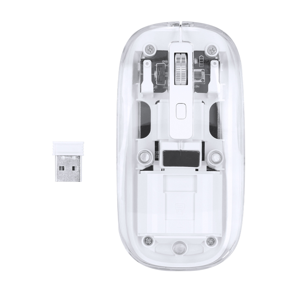 Draadloze optische muis in een origineel ontwerp, met een transparant die de interne componenten van het apparaat laat zien. Ingebouwde 300 mAh batterij en Type C oplaadpoort (kabel meegeleverd). Inclusief DPI-knop, met plug-and-play USB-aansluiting, en wordt geleverd in een individuele doos met kraftontwerp.