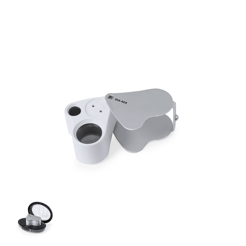 30x en 60x inklapbare loep gemaakt van duurzaam metaal en ABS. Met geïntegreerde LED-verlichting en grote vergroting voor een zeer close-up van de kleinste details zonder vervorming. Ideaal voor het inspecteren van kleine voorwerpen, tekst, enz. Het heeft ook een accessoire om op te hangen en wordt geleverd in een koffer met gewatteerde binnenkant voor extra bescherming. Werkt op batterijen (inclusief knoopcelbatterijen), met speciale sleutel om ze te vervangen als ze leeg zijn. Gepresenteerd in een zwarte kartonnen doos.