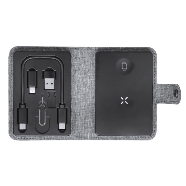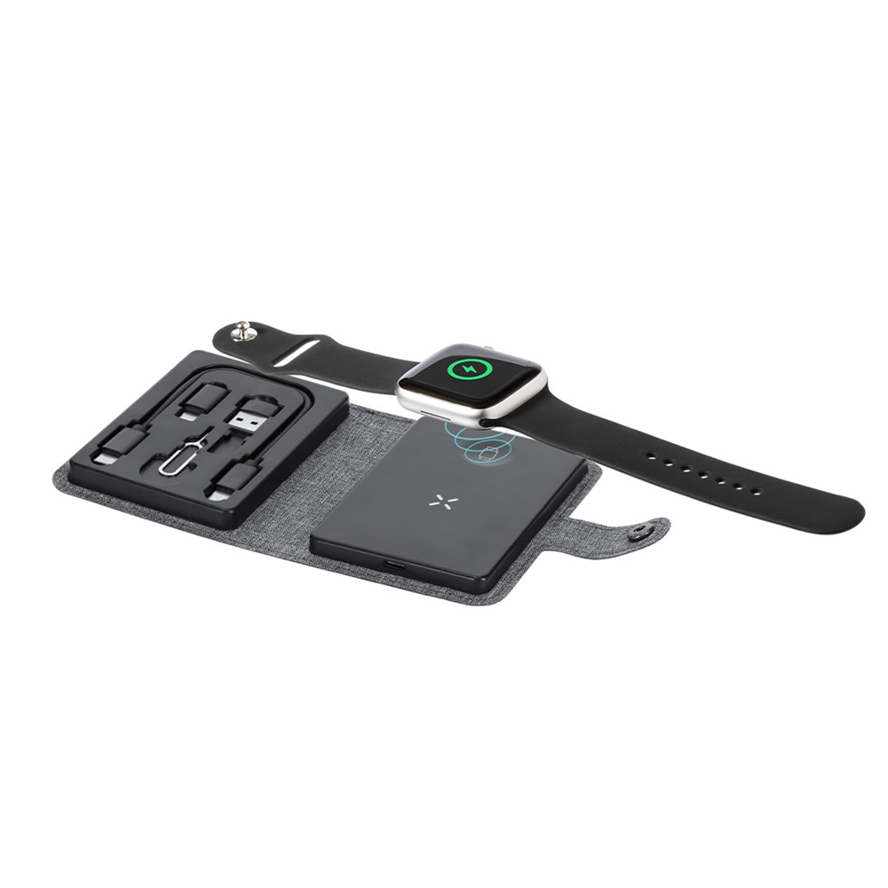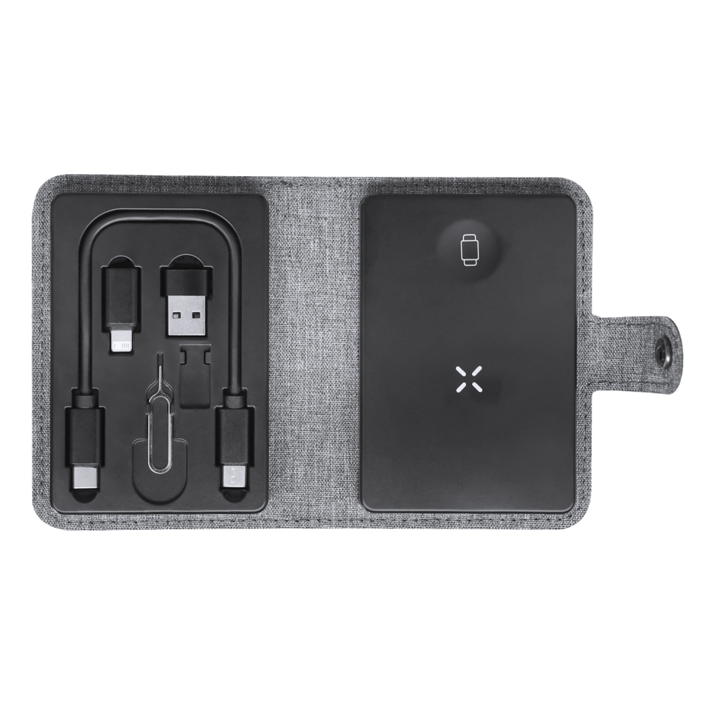 Complete oplaadbasis gemaakt van 300D RPET. Compacte behuizing met drukknoopsluiting en inclusief Qi draadloos oplaadstation voor smartphones, oordopjes en smartwatches. Geleverd met Type-C aansluitkabel aan beide uiteinden, plus USB- en lightning/micro USB-adapters. De set wordt gecompleteerd door een SIM-kaartuitwerper en een compartiment voor het opbergen van een Micro SIM-kaart. Met RPET-logo.RPET-materiaal is gemaakt van gerecycled plastic, waardoor het hergebruik van plastic afval wordt bevorderd en bijdraagt aan de duurzaamheid van de planeet.
