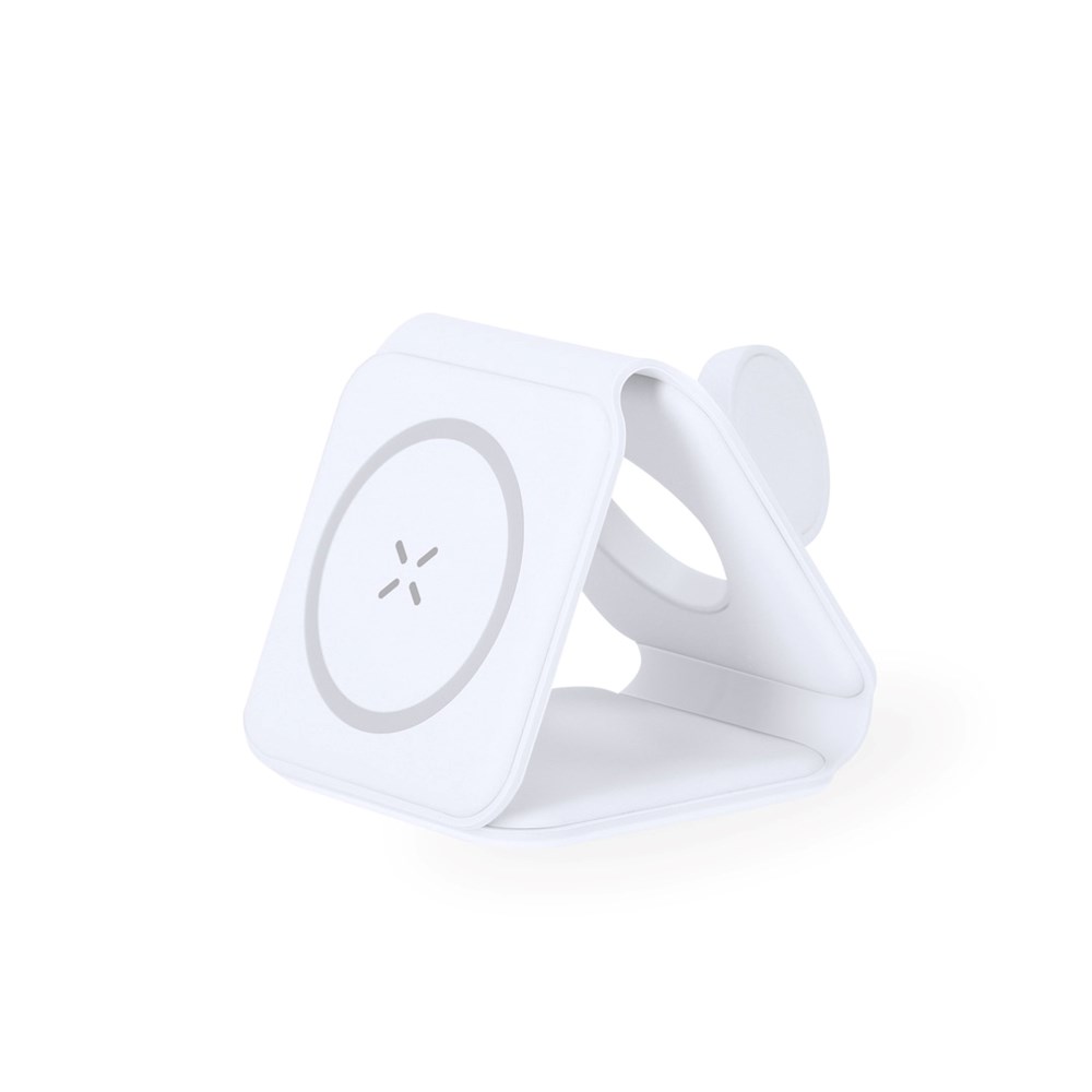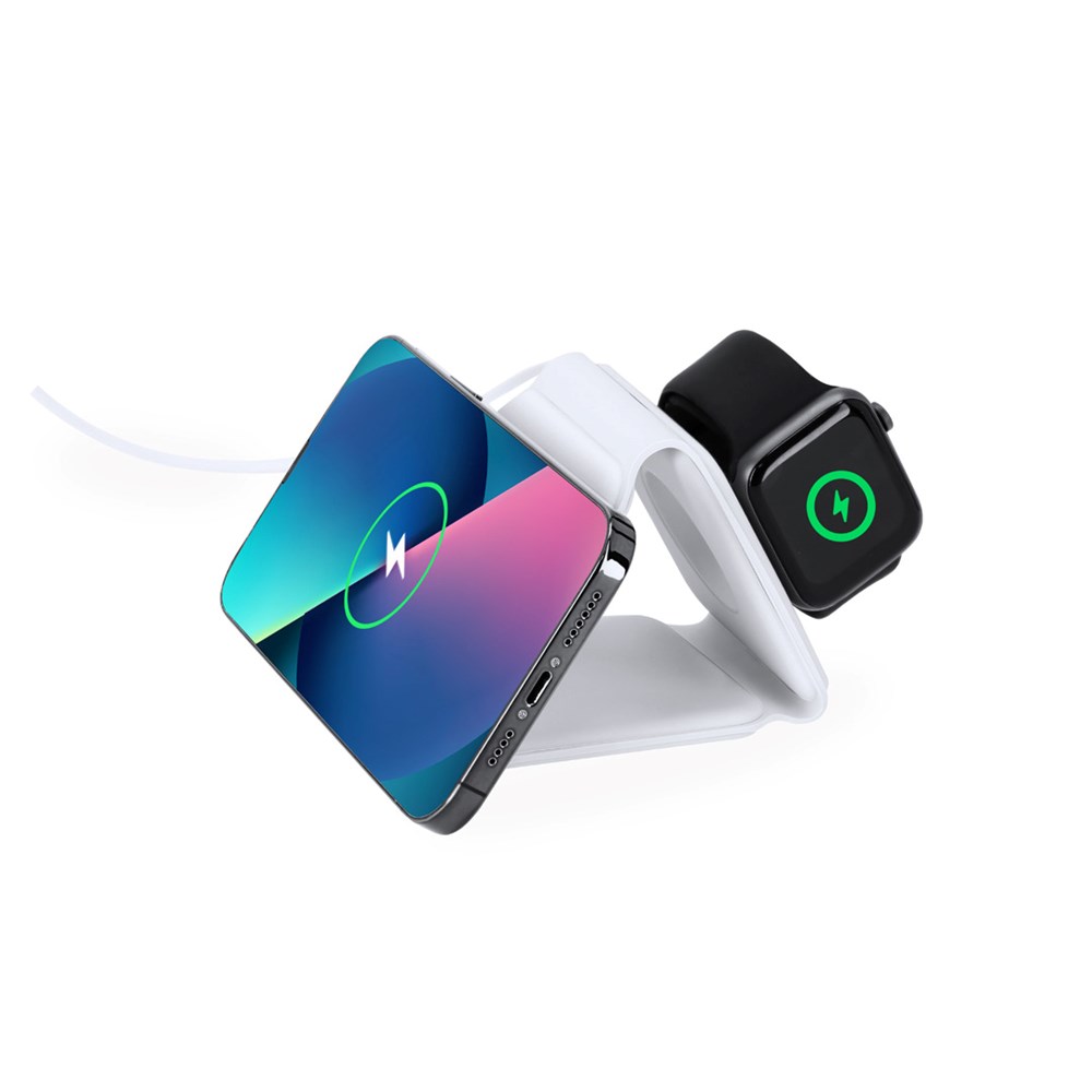 Complete magnetische draadloze oplader 15W, ontworpen voor gelijktijdig opladen van smartphone, koptelefoon en smartwatch. Een alles-in-één gadget: opvouwbaar, draagbaar, compact van formaat, zeer veelzijdig en functioneel in design. Aansluiting via USB Type C -kabel inbegrepen- en gemaakt van duurzaam wit ABS.Gefabriceerd volgens RoHS-normen en in overeenstemming met de volgende veiligheidseisen:Oververhittingsbeveiligingssysteem.Overlaadbeveiligingssysteem.Blokkadesysteem om kortsluiting te voorkomen.