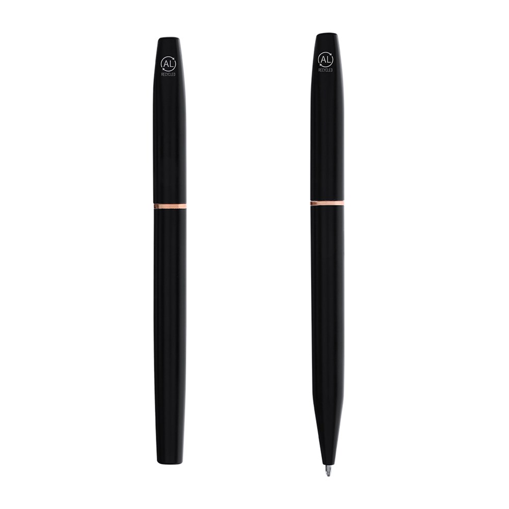 Set balpen en rollerpen van gerecycled aluminium, in een elegant matzwart ontwerp met onderscheidende roze gouden accenten. Balpen met draaimechanisme en rollerpen met dop, beide met metalen clip. Blauwe inkt en gerecycled aluminium logo. Gepresenteerd in een elegant zwart etui.Gerecycled aluminium is een materiaal met bijna oneindige recyclingmogelijkheden, dat zijn oorspronkelijke eigenschappen behoudt en minder energie verbruikt in het proces.GRS (Global Recycled Standard) certificering, die de gerecyclede oorsprong van het materiaal dat wordt gebruikt om het product te produceren, garandeert.