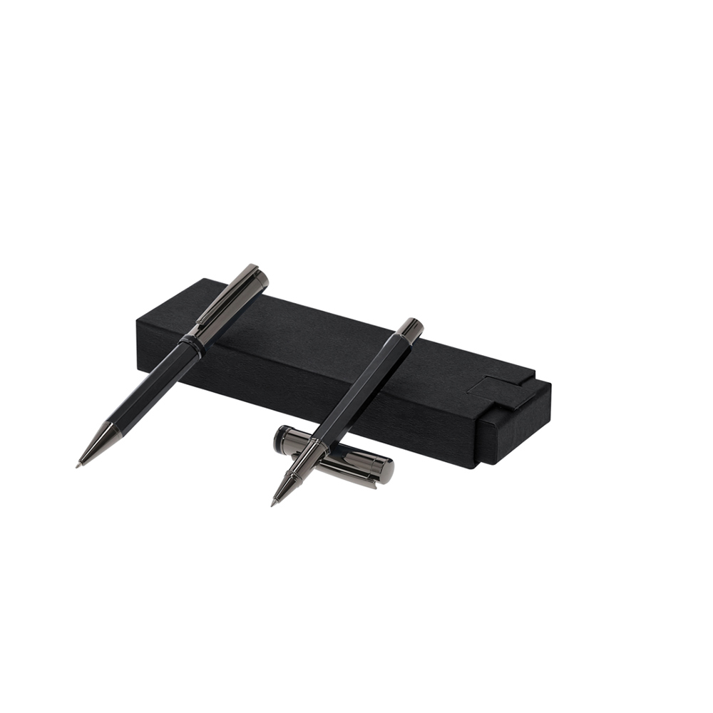 Exclusieve set van balpen en rollerpen van de hoogste kwaliteit uit de Limited Edition collectie. Een modern, functioneel en prachtig accessoire dat alle verwachtingen overtreft. Onderscheiden door zijn elegante, minimalistische ontwerp. Gemaakt van sterk, duurzaam roestvrij staal, in perfecte combinatie met aluminium. Balpen met verfijnd draaisysteem en rollerpen met praktische dop. Zeshoekig gripontwerp in matte metallic kleuren en een sobere glanzende antraciet bovenkant. Met metalen clip, blauwe inkt en navulbaar (rollerpen met jumbo cartridge).Uit de perfecte combinatie van exclusiviteit en design komt Limited Edition, een speciale collectie van promotionele ideeën in beperkte oplage. Een nieuw concept, geïnspireerd door de fusie van premium producten met de nieuwste en meest innovatieve trends en met een beperkte selectie beschikbaar, die een geschenk omtovert tot een unieke en onvergetelijke ervaring.Exclusieve Limited Edition presentatiekoffer, met een ontwerp dat wordt beschermd door industriële eigendomsrechten.Inclusief kaart met beschrijving van de Limited Edition in gerecycled karton.