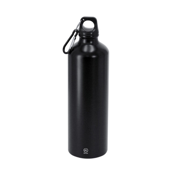 Fles van 800 ml capaciteit. Gemaakt van stevig en duurzaam gerecycled aluminium. Met zwarte schroefdop en bijpassende karabijnhaak voor eenvoudig transport. Lichaam met een matte afwerking. BPA-vrij. Inclusief het label van gerecycled aluminium.Gerecycled aluminium is een materiaal met bijna oneindige recyclingmogelijkheden, zonder zijn oorspronkelijke eigenschappen te verliezen en met minder energiegebruik tijdens dit proces.