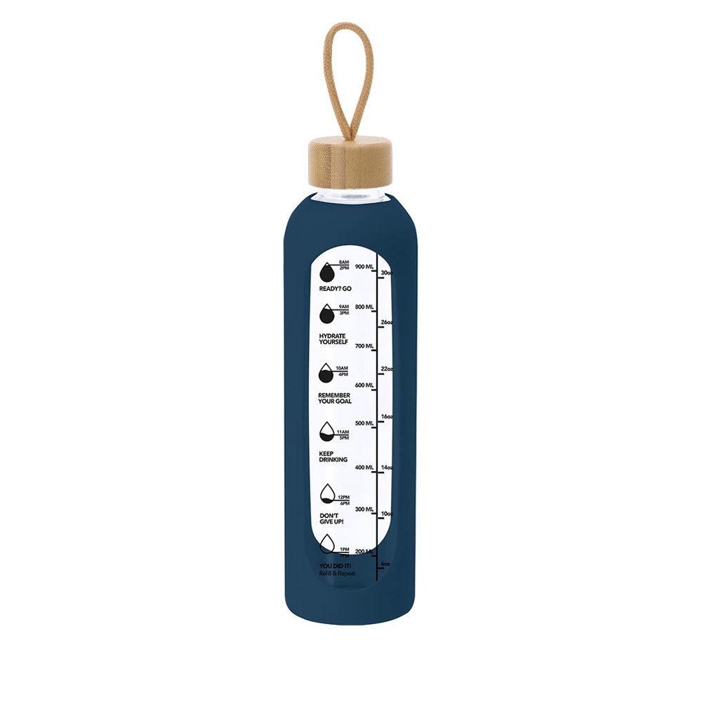 Fles van 1L gemaakt van glas, ontworpen om een goede hydratatie te bevorderen. Bedekt met een siliconen hoes die beschermt en een comfortabele en veilige grip biedt.Bevat een indicator van capaciteit in liters en ounces, vergezeld van motiverende zinnen die inspireren tot een goede dagelijkse hydratatie. Dop, gemaakt van bamboe, bevat een praktische koord voor gemakkelijk transport. BPA-vrij.