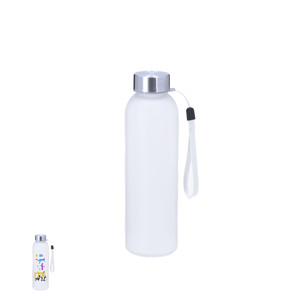 Fles van 500 ml capaciteit, ideaal voor sublimatie-markering. Lichaam gemaakt van frosted glas en een BPA-vrij roestvrijstalen dop. Inclusief praktische draagkoord.