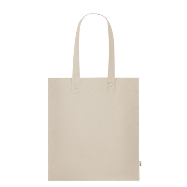 Tas gemaakt van gerecycled RPET-vilt. Met lange versterkte handgrepen. Belastbaarheid tot 6kg. Inclusief RPET-label op de buitenkant.Het RPET-materiaal wordt gemaakt van gerecycled plastic, om zo de hergebruik van plastic afval te bevorderen en te helpen bij de duurzaamheid van de planeet.