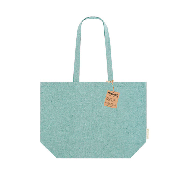 Tas voornamelijk gemaakt van gerecycled katoen van 220 g/m2 met grote bodem. Lange handgrepen van 70 cm met versteviging en gestikte afwerking. Logo op zijlabel en weerstand tot 6 kg.