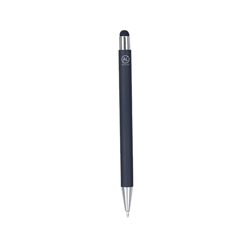 Balpenpunter met drukknopmechanisme gemaakt van gerecycled aluminium. Metalen clip met chroomafwerking, afgewerkt met een bijpassende punt. Rubberachtige afwerking, speciaal ontworpen voor lasergravure. Label van gerecycled aluminium aan de bovenkant van de pen. Van jumbo-cartouche en in blauwe inkt. Gerecycled aluminium is een materiaal met bijna eindeloze recyclagemogelijkheden, zonder verlies van oorspronkelijke eigenschappen en verbruikt minder energie in dit proces.GRS-certificering (Global Recycled Standard / Global Recycled Standard), die de gerecycleerde oorsprong van het gebruikte materiaal voor de fabricage van het product garandeert.