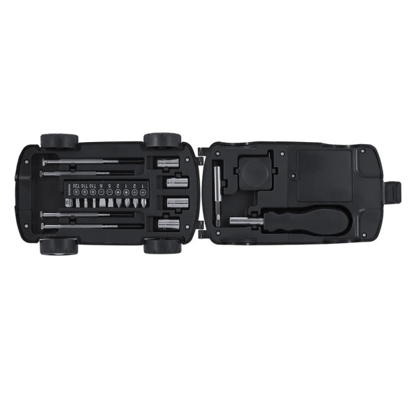 Set gereedschap met een etui in de vorm van een auto en een LED-lamp. Bevat 20 gereedschappen. Inclusief:- Precisieschroevendraaierset (plat en Philips)- Bevestigingsgereedschap- Multifunctionele handgreep met verwisselbare platte en sterkop schroevendraaiers- Sleutels voor moeren met een zeskantige kop- RolmeterMet een lampje met 2 ingebouwde LED's in de etui, gevoed door 4 AAA-batterijen (niet meegeleverd).