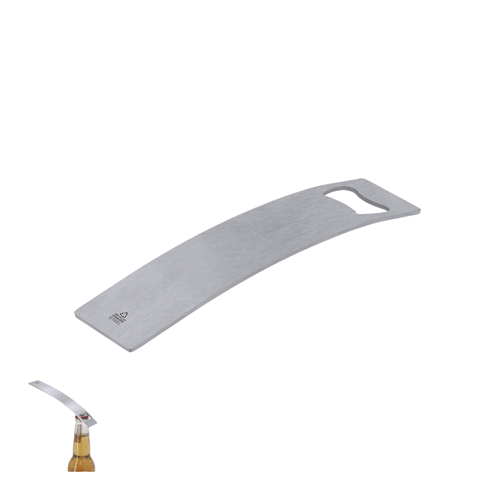 Opener in gerecycled roestvrij staal. Inclusief onderscheidingsmerk gerecycled roestvrij staal.Staal is een van de meest gevraagde materialen en is bijna overal te vinden, van dagelijkse producten tot grote constructies. Met talloze eigenschappen, waaronder duurzaamheid en een hoog herbruikbaarheid, waardoor het een zeer gewaardeerde optie is in duurzaamheidoplossingen. Correct verwerkt, maakt het mogelijk om nieuwe eindeloos bruikbare hulpbronnen te verkrijgen.