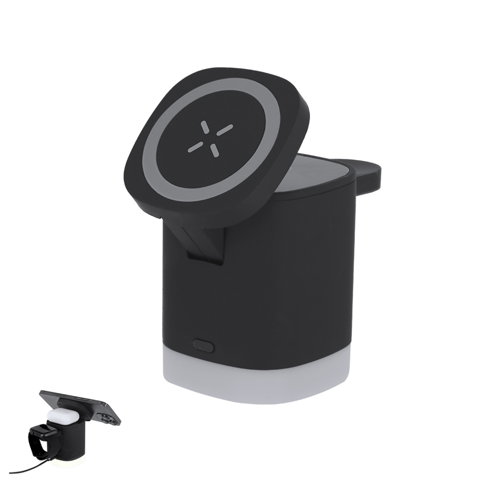 Magnetische draadloze oplader 3-in-1 van 15W, gemaakt van gerecycled ABS (RABS). Ontworpen voor het gelijktijdig opladen van smartphone, oordopjes en smartwatch.Bevat een geïntegreerde lamp in de basis met 2 instelbare lichtmodi in wit.Aansluiting Type C inbegrepen. Een alles-in-één gadget: opvouwbaar, draagbaar, veelzijdig en functioneel ontwerp.RABS is een hoogwaardig recyclebaar kunststof van grote sterkte met talloze toepassingen, waardoor het een eco-vriendelijke oplossing vormt.Vervaardigd conform de RoHS-normen en voldoen aan de volgende veiligheidsvereisten:Systeem ter bescherming tegen oververhitting.Systeem ter bescherming tegen overbelasting.Systeem ter bescherming tegen kortsluitingen.