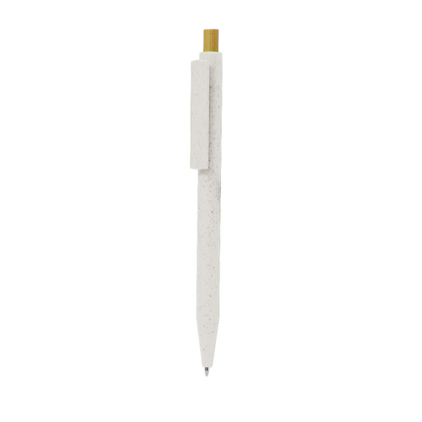 Aanraakhulpmiddel gemaakt van tarwevezel. Met bijpassende behuizing en clip, drukmechanisme gemaakt van bamboe en met blauwe inkt. Met een herkenbaar logo van tarwevezel gemarkeerd op de behuizing. Tarwevezel bevordert het gebruik van natuurlijke grondstoffen, waardoor de uitstoot van schadelijke stoffen wordt verminderd.