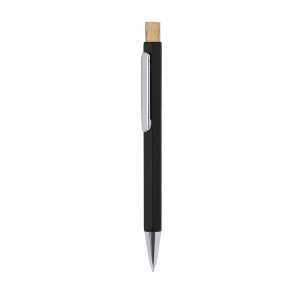 Elegante aanraakhulpmiddel gemaakt van gerecycled aluminium. Behuizing in een elegante hexagonale vorm, met verchroomde clip en punt. Met drukmechanisme gemaakt van bamboe en met blauwe inkt. Met een herkenbaar logo van gerecycled aluminium gemarkeerd op de behuizing.Gerecycled aluminium is een materiaal met bijna oneindige recyclingmogelijkheden, zonder de oorspronkelijke eigenschappen te verliezen en met minder energieverbruik in dit proces.GRS-certificering (Global Recycled Standard), die de gerecycleerde oorsprong van het gebruikte materiaal garandeert voor het vervaardigen van het product.Materialen zoals bamboe bevorderen het gebruik van natuurlijke grondstoffen, waardoor de uitstoot van schadelijke stoffen wordt verminderd. Het komt van een sterk en veelzijdig plant, dat snel groeit en zich regeneratief is, en is het een uitstekende alternatieve voor traditionele houtgebruik.