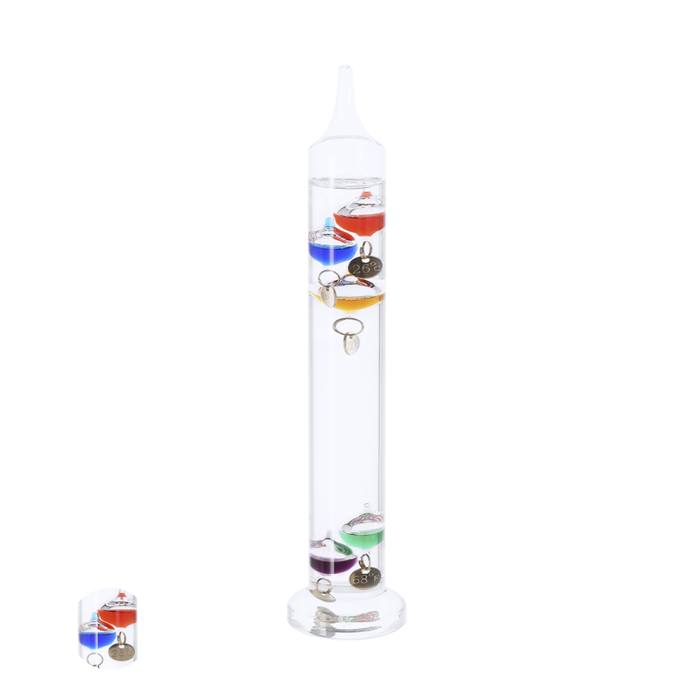 Galileo thermometer van borosilicaatglas met een elegant en compact ontwerp. Met 5 glazen ampullen in kleuren (paars, groen, oranje, blauw en rood) die temperaturen in °C en °F aangeven met gouden labels, die zich op basis van de buitentemperatuur door de thermometer bewegen.