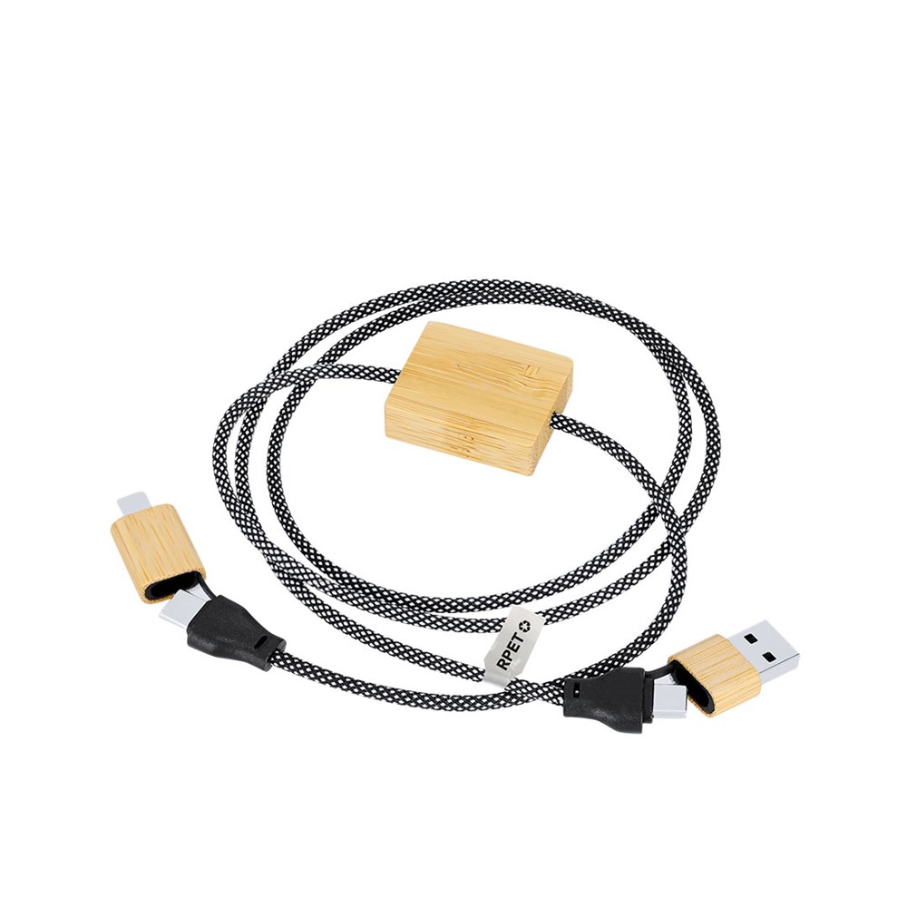 Oplaadkabel van 60 W in een combinatie van RPET en bamboe. Met Type C en USB ingangen en Lightning, Micro USB en Type C uitgangen. Laadvermogen: Tot 60W, waarmee een snelle en efficiënte oplading wordt gegarandeerd.