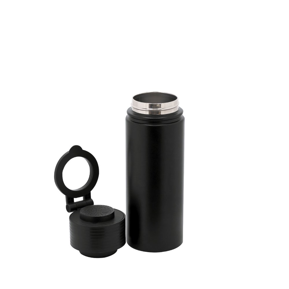 Thermosfles met geïntegreerde Bluetooth® 5.4 luidspreker van 3W. Met een capaciteit van 500 ml en gemaakt van dubbelwandig roestvrij staal, wat maximale duurzaamheid en uitstekende temperatuurbehoud van dranken garandeert, of het nu koud of heet is. Deksel met schroefsysteem en BPA-vrij, en bevat een verstelbare ondersteuning voor smartphone met Magsafe-technologie. De geïntegreerde Bluetooth-luidspreker van 600 mAh in de dop is gemakkelijk te verwijderen dankzij het schroefsysteem.