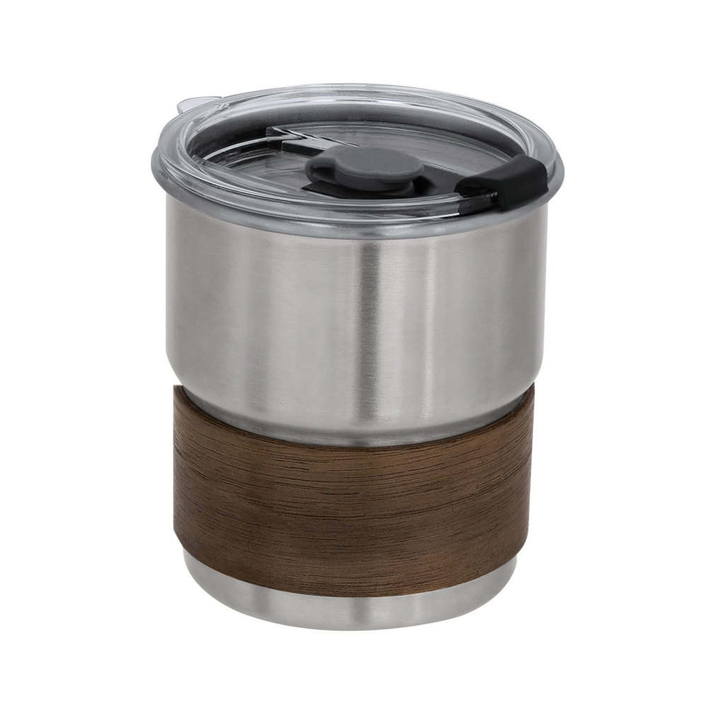 Beker gemaakt van roestvrij staal en verfijnd hout. Met een capaciteit van 250 ml. Inclusief elegante houten band. Inclusief hermetisch transparant deksel met doseerder in de deksel en een gat voor rietjes, vrij van BPA.