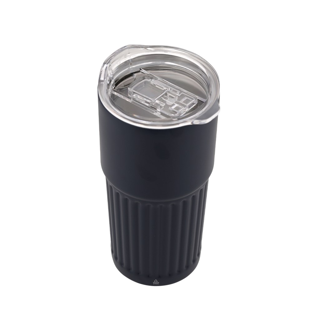 Thermische beker van gerecycled roestvrij staal met dubbele wand en een capaciteit van 500 ml. Buitenaf in matte schuin afwerking. Met een transparante drukdekselafsluiting en eenvoudig te openen doseerder, vrij van BPA. Ideaal om op je bureau, tafel of op ieder oppervlak te zetten om rustig te genieten van je favoriete drank. Antislip siliconen basis. Inclusief kenmerk van gerecycled roestvrijstaal.Roestvrij staal is een van de meest gevraagde materialen en kan bijna overal worden gevonden, van dagelijks gebruik tot grote constructies. Met talloze eigenschappen, waaronder duurzaamheid en een hoge herbruikbaarheid, wat het een gewaardeerde optie maakt in duurzame oplossingen. Wanneer het goed behandeld wordt, levert het nieuwe en eindeloos herbruikbare grondstoffen op.
