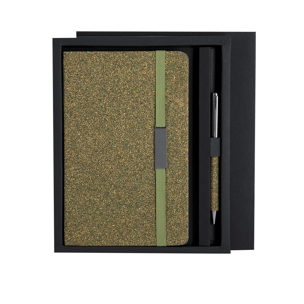 Set van notitieblok en pen gemaakt van Teefiber. Inclusief notitieblok met harde kaft, 80 gelinede pagina's, elastische band met metalen clip en bijpassend boekenlegger. Bevat ook een aluminium pen met chroomafwerking en Teefiber grip, draaiend mechanisme en blauwe inkt. Met logo Tea Grounds gemarkeerd aan de achterkant van het notitieblok. Elegant gepresenteerd in een zwarte doos.Tea Grounds is een duurzaam materiaal gemaakt van gerecyclede theebladeren. Tijdens het verwerkingsproces van thee worden de resten verzameld en samengeperst om ze een tweede leven te geven als nuttige hulpbron. De productie stimuleert de circulaire economie en vermindert de milieubelasting.