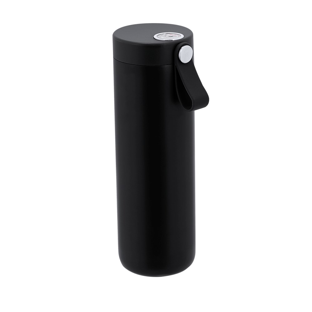 Thermosfles van roestvrij staal met dubbele wand van 500 ml capaciteit, met analoge temperatuurmeter, met een bereik van 0º tot 100º. Met een veiligheidsschroefdop, geïntegreerd siliconen handvat en bijpassend lichaam. BPA-vrij.