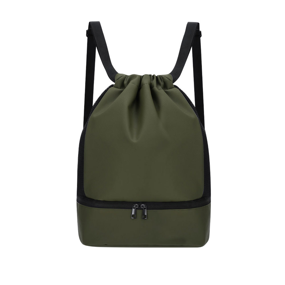 Rugzak in zacht PU met een hoofdvak met trekkoord en een kleine binnenzak met rits. Inclusief bodemzak voor schoenen met een dubbele rits en voorkant met sneltoegang ritsen. Met ademende zijkanten en verstelbare schouderbanden.