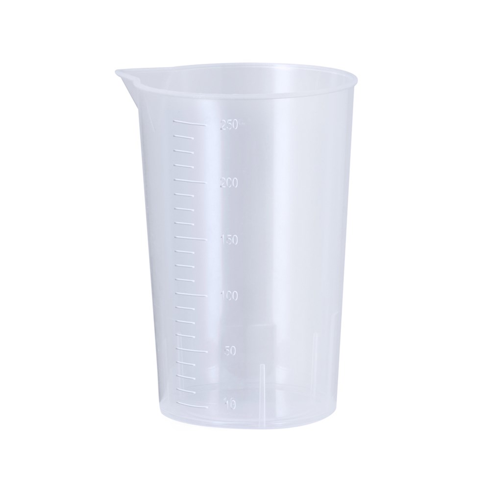 Maatbeker van 250 ml gemaakt van resistent transparant PP. Met zijaanslag in segmenten van 10 ml en schenktuit om morsen te voorkomen.