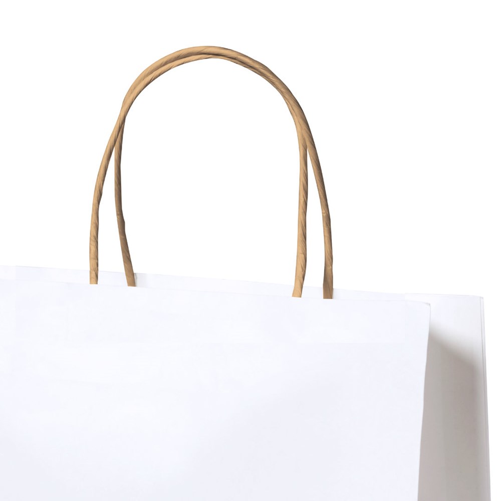 Nature line tas, gemaakt van 100g/m2 gerecycled papier in witte afwerking, met korte versterkte hengsels in natuurlijke kleur en kruisje. Weerstand tot 6 kg in gewicht.