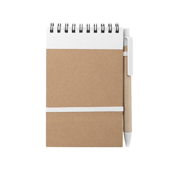 Ring notitieboek van stevig tweekleurig gerecycled karton met zachte kaft, elastische omslag en bijpassende pen van gerecycled karton. In opvallende kleuren.