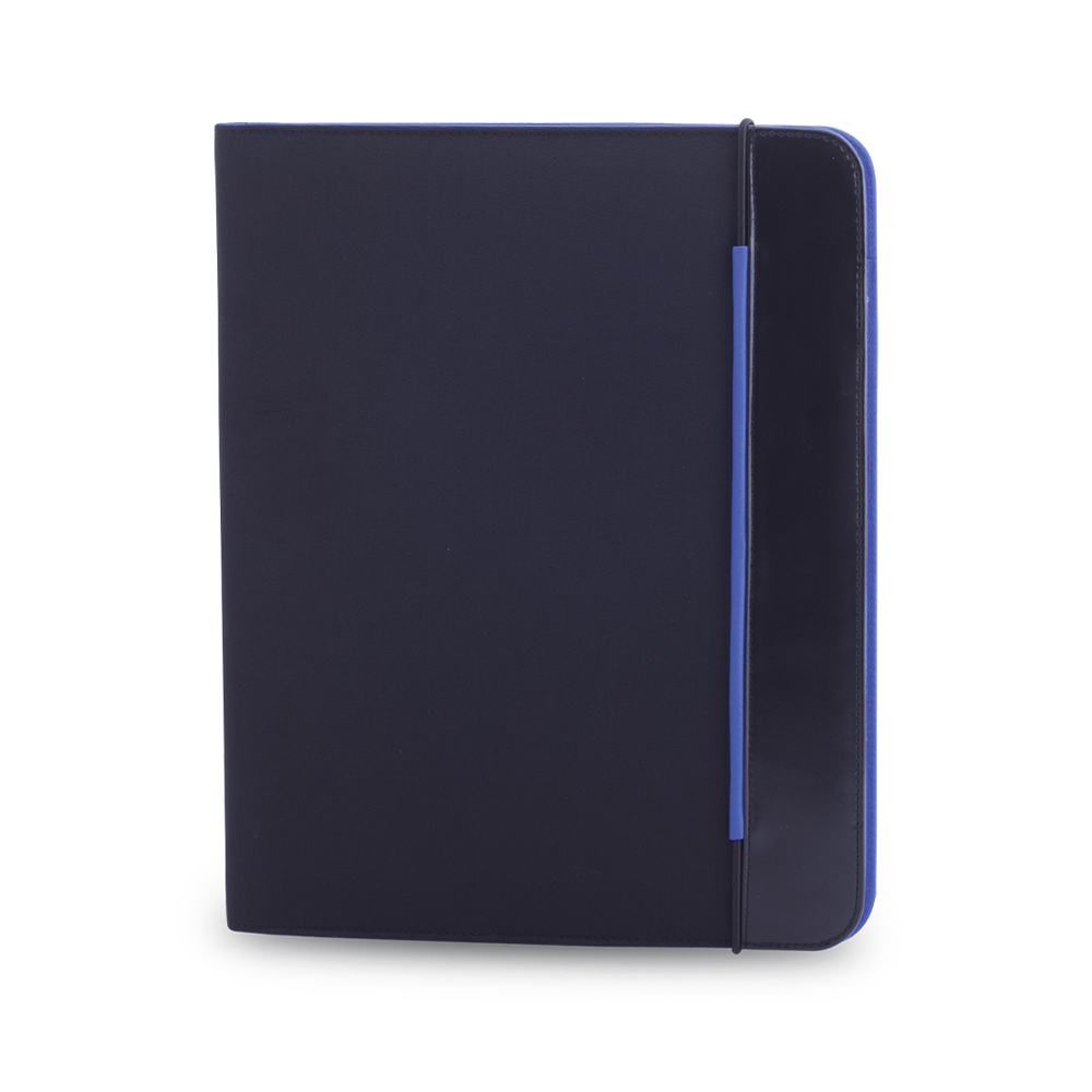 Design schrijfmap met tweekleurenprint in verschillende kleuren, van zacht microfiber met elastische bandsluiting. Overeenkomende kleur binnen met blocnote van 20 blanco bladen, klepzak, kaarthouders en pennenhouder.