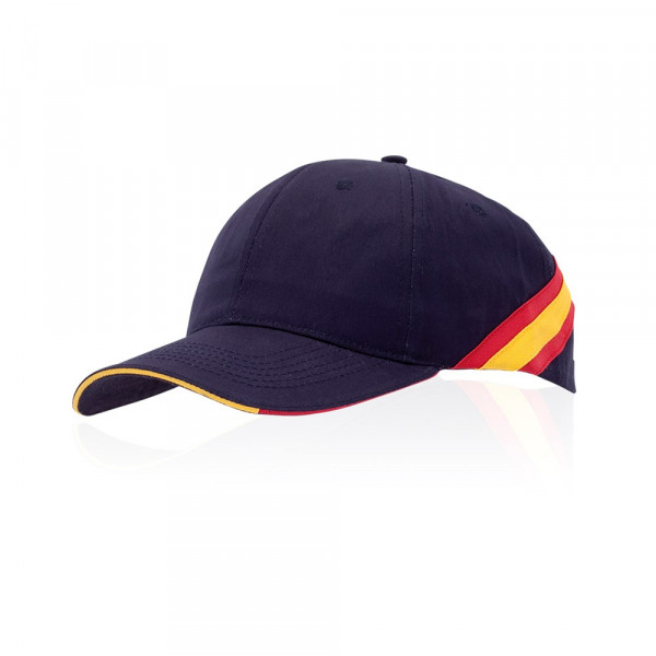 Pet met Spaanse vlag ontwerp in geborsteld katoen. 6 panelen, met tricolor bies en Spaanse vlagkleuren op de zijkanten en de achtergedeelte. Met geborduurde ventilatiegaten en verstelbare klittenbandsluiting.