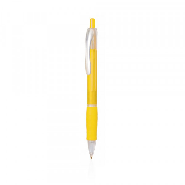 pen van duurzaam ABS met drukknopmechanisme. Origineel tweekleurig ontwerp met heldere en gevarieerde kleuren in een gladde afwerking, met bijpassende comfortgreep. Blauwe inkt.
