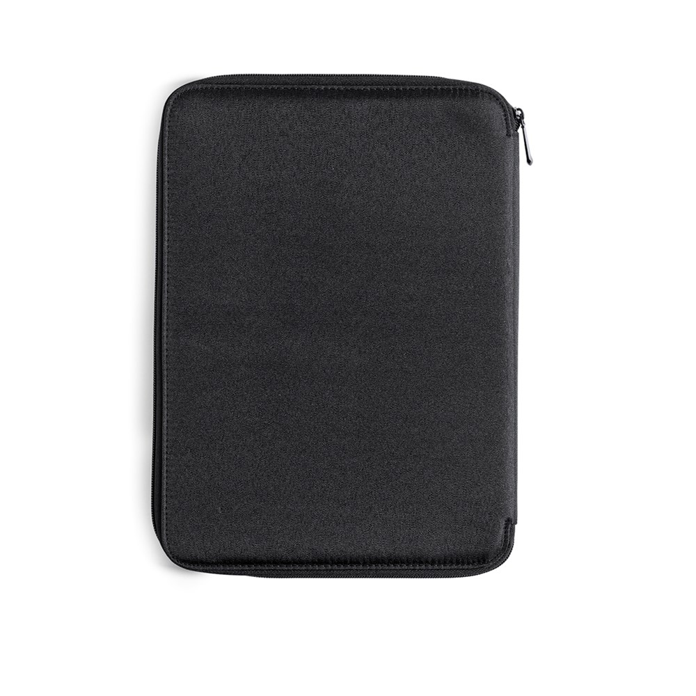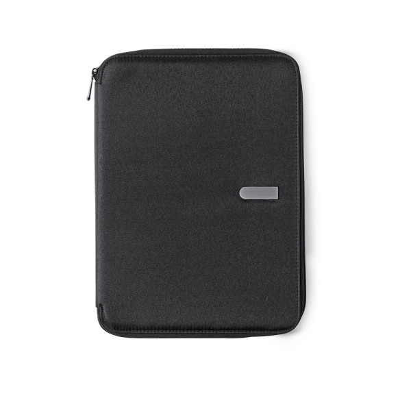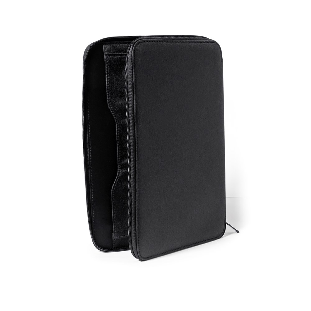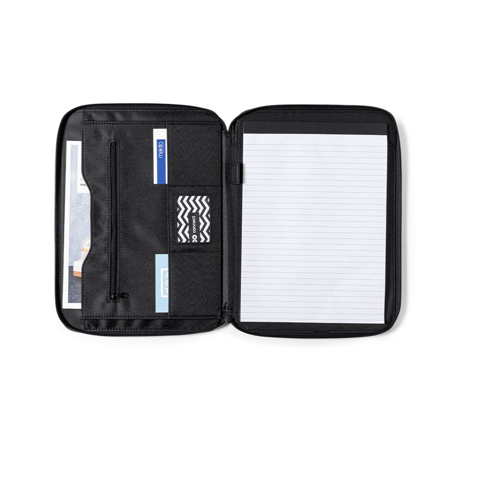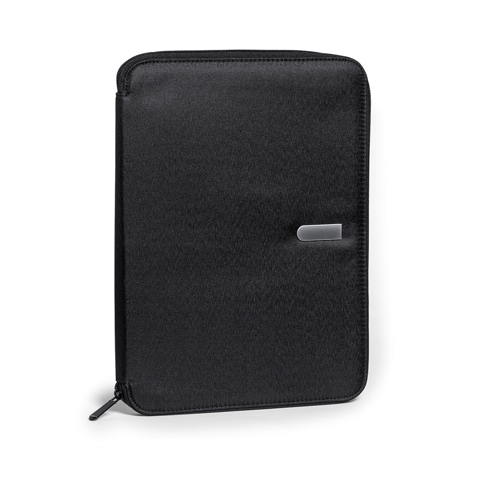 Elegante documenten hoes met ritssluiting van zachte microvezel. Binnenkant met blok van 20 gelinieerde vellen, een vak met ritssluiting, een klepvak, kaarthouders en een pennenhouder. Met elegant metalen plaatje vooraan voor laserprint.