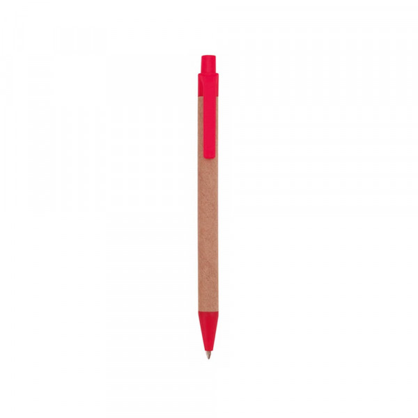 Balpen in een originele combinatie met body in gerecycled karton van natuurlijke kleur en accessoires in verschillende kleuren. Blauwe inkt.