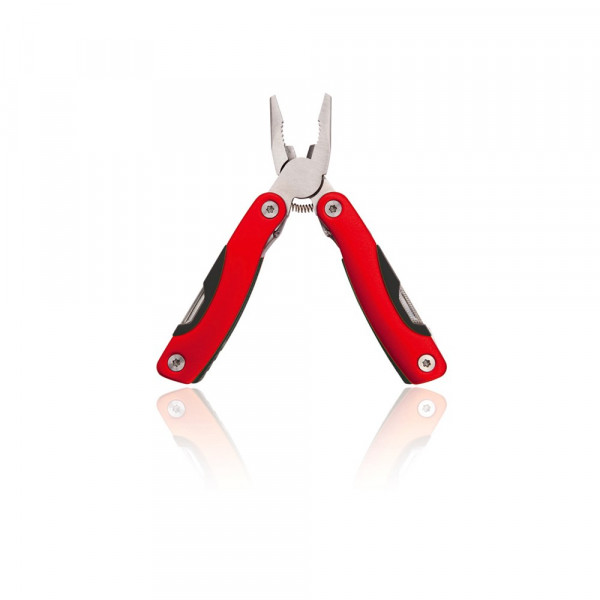 Multi-tool met stevige roestvrijstalen behuizing met 12 functies. Inclusief plat mes, gekarteld mes, schroevendraaiers, vijl, vijlopener en tang. Uitgevoerd in heldere kleuren en gepresenteerd in een stevige polyester schede in een individuele doos.